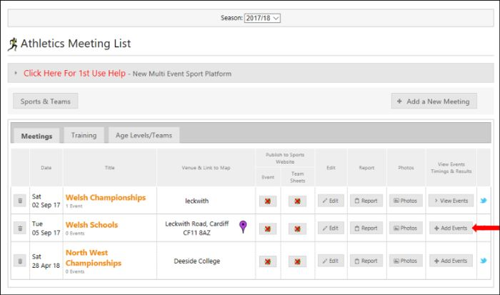 To record the results for each event you can upload the time / distance achieved for each event and the place (if a race).