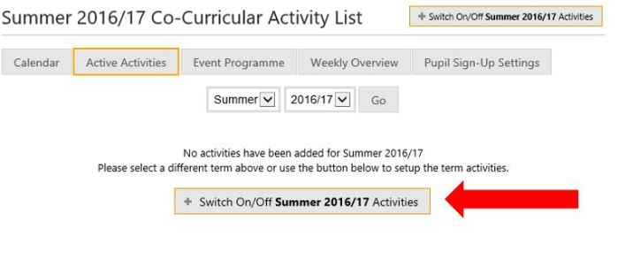 - Click the + Switch On/Off “selected term” Activities button (see red arrow on the screenshot below):