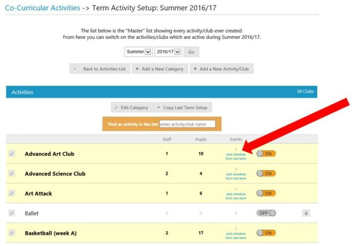 - This allows you to copy the setup for this category from last term and it will switch on all activity clubs which were switched on last term. This is a great time saver and any activity clubs which are already switched on for this category will not be affected by this.
