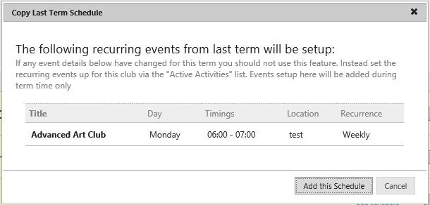 Note: If any event details have changed for the new term then you should not use this feature. Instead set the recurring events up for this club via the "Active Activities" list.
