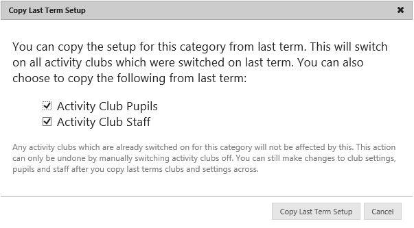 Note: This action can only be undone by manually switching activity clubs off. You can still make changes to club settings, pupils and staff after you copy last terms clubs and settings across.