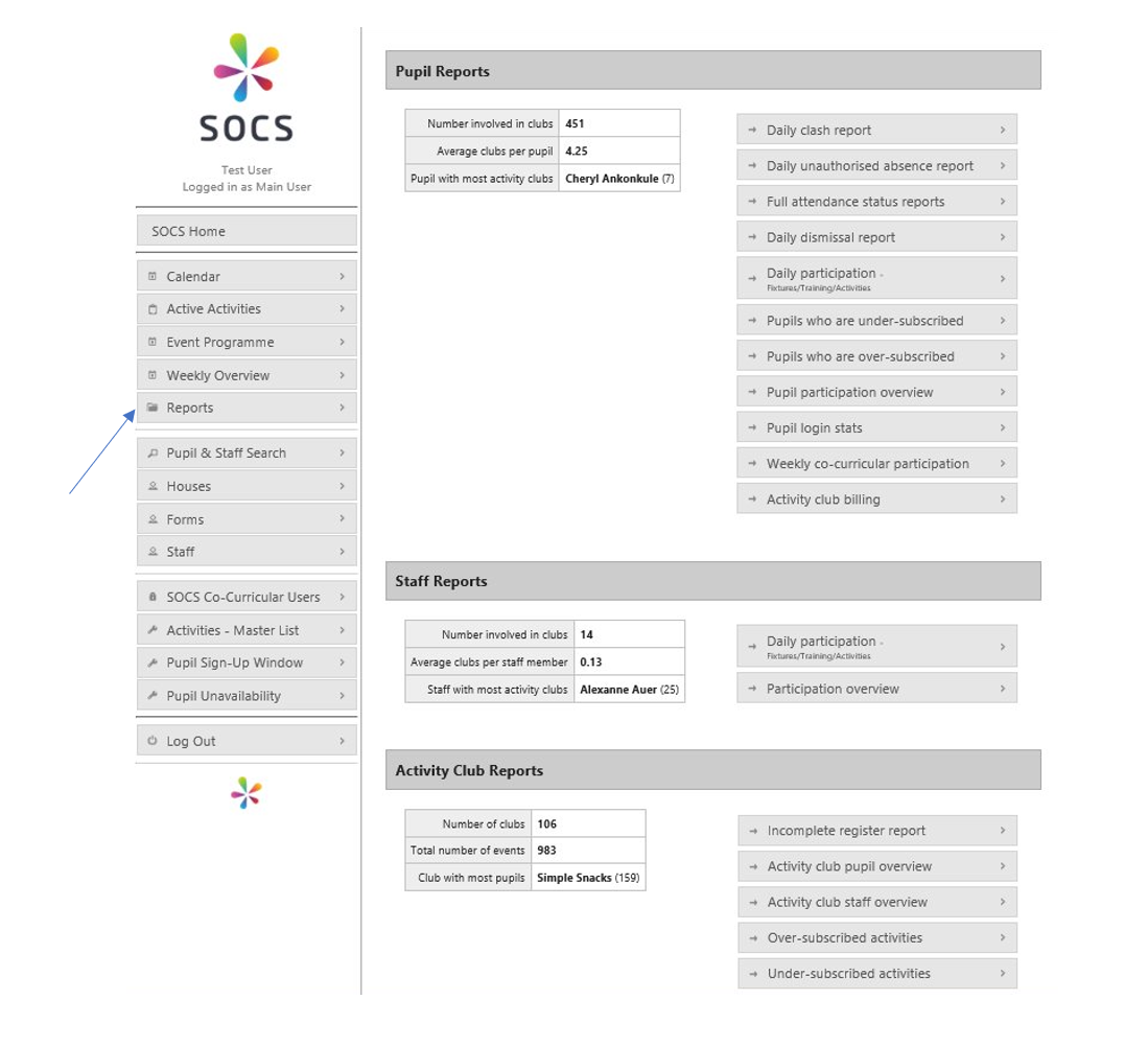 Select Reports in the left hand menu of SOCS Co-curricular to access the available reports which are categorised by Pupil, Staff and Activity Club.