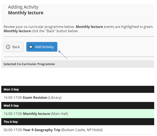 In this case, the ‘Add Activity’ button in the previous screenshot will no longer be available; instead the parents/pupils will need to click ‘Add Event’ next to the individual sessions they would like to attend.