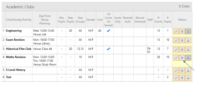 If this rule is left unticked and the club is also setup as Invite Only, staff will need to manually allocate students to the club registers. Instead of adding pupils to a club, you will need to add pupils to each individual event. You will no longer be able to add pupils to the club, therefore the ‘add pupils’ icon will turn dark grey and you will need to add pupils to each event, as outlined below.